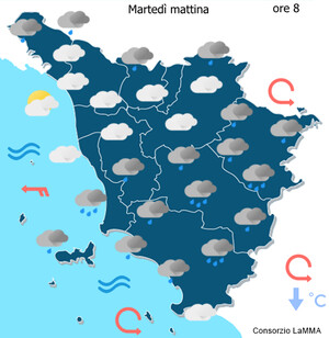 Cielo: molto nuvoloso o coperto con precipitazioni sparse, anche temporalesche. Nubi più irregolari dal pomeriggio con fenomeni più isolati, in esaurimento in serata.